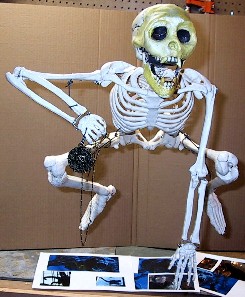 The next task was to adapt the skull to the skeleton. In the photo of his back, you'll note that there's a hole in his head. (Insert joke here.) This was to screw the head atop the conveniently provided threaded shaft of the backbone. (Note how happy he looks in the photo above left.) I also Sculpy'd the skull using a photo of a Capuchin monkey I found on the web. (Jack is a Capuchin Monk'. Ha!)