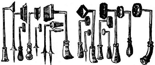 ![]() Cutlery Cautery Irons - From Left: Paré (1649), Pierre Dionis (1740), Jacques Guillemeau (1597), and an Iron forged by Adam Cyphers |