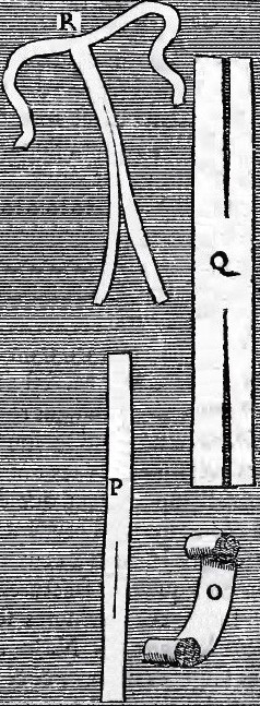 The last, R, is a figur'd Bandage, representing a T; 'tis call'd figur'd, because made of two Bands sew'd together: There are simple or single ones, as this; and others which are slit and double, which are used on several Occasions. This Bandage is adapted to several Parts; 'tis us'd above all in Lithotomy and the Fistula of the Anus."